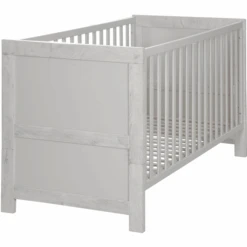 La posición de tumbado superior de la cuna de 3 posiciones de altura regulable es especialmente cómoda para la espalda de los padres. Puedes levantar fácilmente a tu bebé de la cuna desde esta cómoda altura de descanso. Más adelante, la posición intermedia es la opción perfecta, ya que las 3 barras deslizantes extraíbles del elemento de la cuna permiten a su hijo pequeño entrar y salir con seguridad. La posición más baja de la cuna ajustable en altura está destinada a la cama Junior . Cuando su hijo sea mayor, la cuna combinada puede convertirse en una cama Junior en unos pocos y sencillos pasos utilizando los laterales de conversión que están disponibles por separado. El cabecero y el piecero de la cuna combinada pueden dividirse. Cuando se convierte en una cama Junior , se utilizan las dos mitades superiores del cabecero y el piecero y se crea un nuevo aspecto en la habitación de los niños. La cuna combinada «Mila» puede utilizarse hasta que el niño tenga 7 años (o hasta un peso corporal de 50 kg).