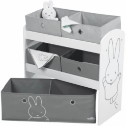 Gracias a las grandes asas en forma de Metal L, las cajas de tela se pueden retirar fácilmente y volver a colocar en el estante de juguetes. La caja de tela más baja y más grande está impresa con un lindo conejito Miffy para combinar con el motivo de impresión de los paneles laterales del estante de almacenamiento. Con otros productos de la colección «Miffy roba «, la habitación de los niños puede transformarse en un paraíso Miffy para niños y niñas. Con 5 cajas de tela.