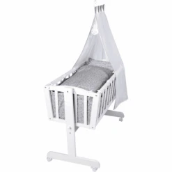 La cuna para bebé incluye un hermoso juego de cuna miffy® con juego de ropa, un colchón, un nido, dosel y soporte y un juego de ruedas con freno. La cuna está equipada con barras planas robustas y de alta calidad, así como una función de mecedora con botón de bloqueo. La cuna mecedora se puede convertir en una cuna o en mecedora. El juego completo de roba es adecuado desde el nacimiento hasta aproximadamente 6 meses o hasta que el bebé pueda incorporarse. Todos los materiales utilizados están libres de sustancias nocivas y han sido certificados. La ropa de la cuna con el diseño miffy®, están hechas de algodón 100% certificado y ofrecen un clima óptimo para dormir. La cama acolchada para niños está hecha de fibra climática transpirable y que compensa la temperatura y se puede usar durante todo el año, resistente y fácil de cuidar. Gracias a su acolchado, no se desliza durante el lavado.