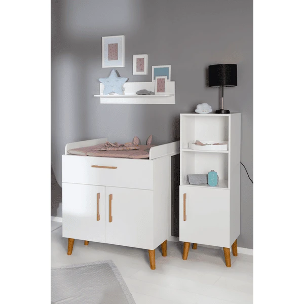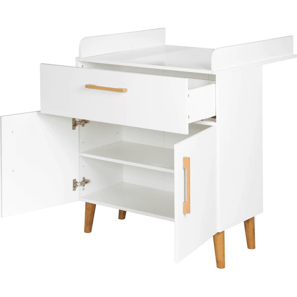 El cambiador ofrece mucho espacio para guardar los utensilios de cambio. Así tienes todo a mano para el cuidado del bebé. Con otros muebles infantiles de la serie «Mick», puedes crear una elegante habitación infantil o de bebé. El cambiador de bebés con cambiador roba es un auténtico todoterreno que le servirá durante muchos años. El cambiador estable puede utilizarse como asiento elevado para su hijo de guardería, de modo que pueda ayudarle a vestirse fácilmente en una posición cómoda de pie. Más adelante, el mueble cambiador puede utilizarse como cómoda en el salón o en el cuarto de los niños.