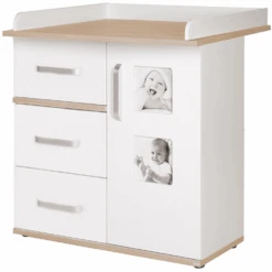 Los elementos decorativos de roble de Sanremo son las características especiales de los muebles de la serie de habitaciones infantiles roba Pia. En esta habitación infantil, la decoración especial se combina con los conocimientos técnicos. El cierre suave de las puertas y los cajones aden es imprescindible en este caso. Los marcos de fotos integrados son un reclamo especial: equipados con fotos personales, cada mueble se convierte en algo único. El cambiador Pia también está equipado con un cambiador. Con el estante lateral roba Pia, el espacio vacío bajo el cambiador puede aprovecharse de forma óptima.